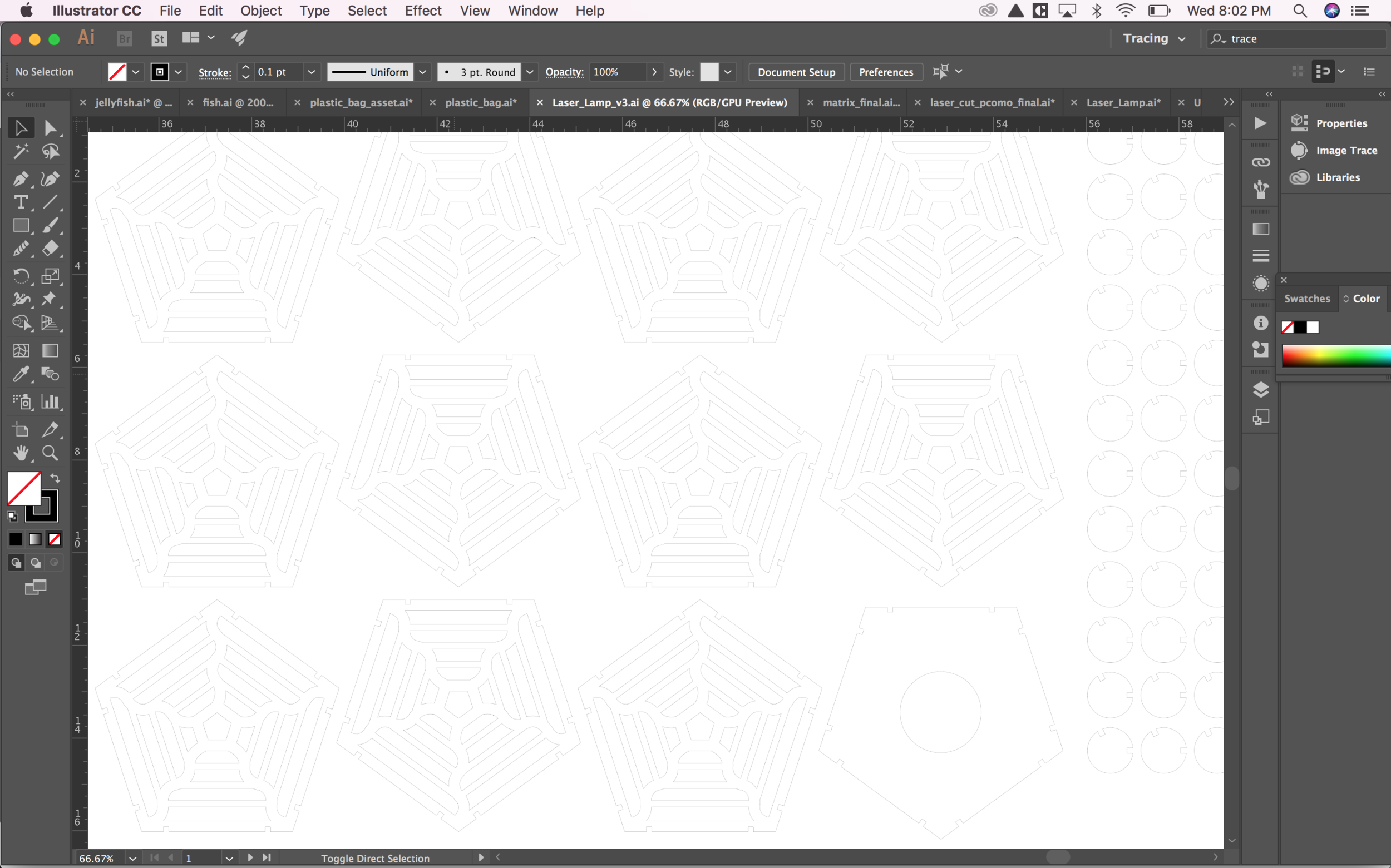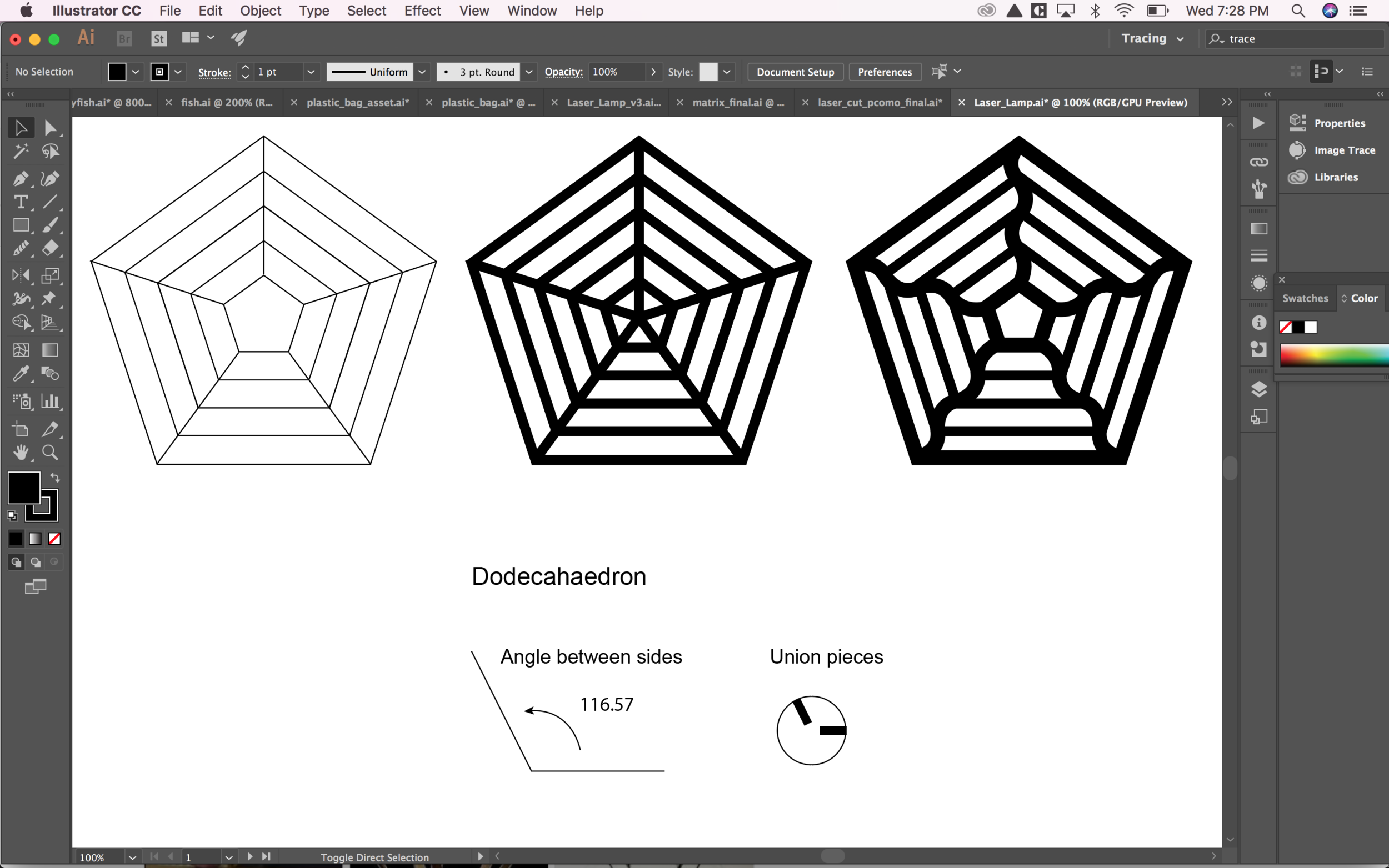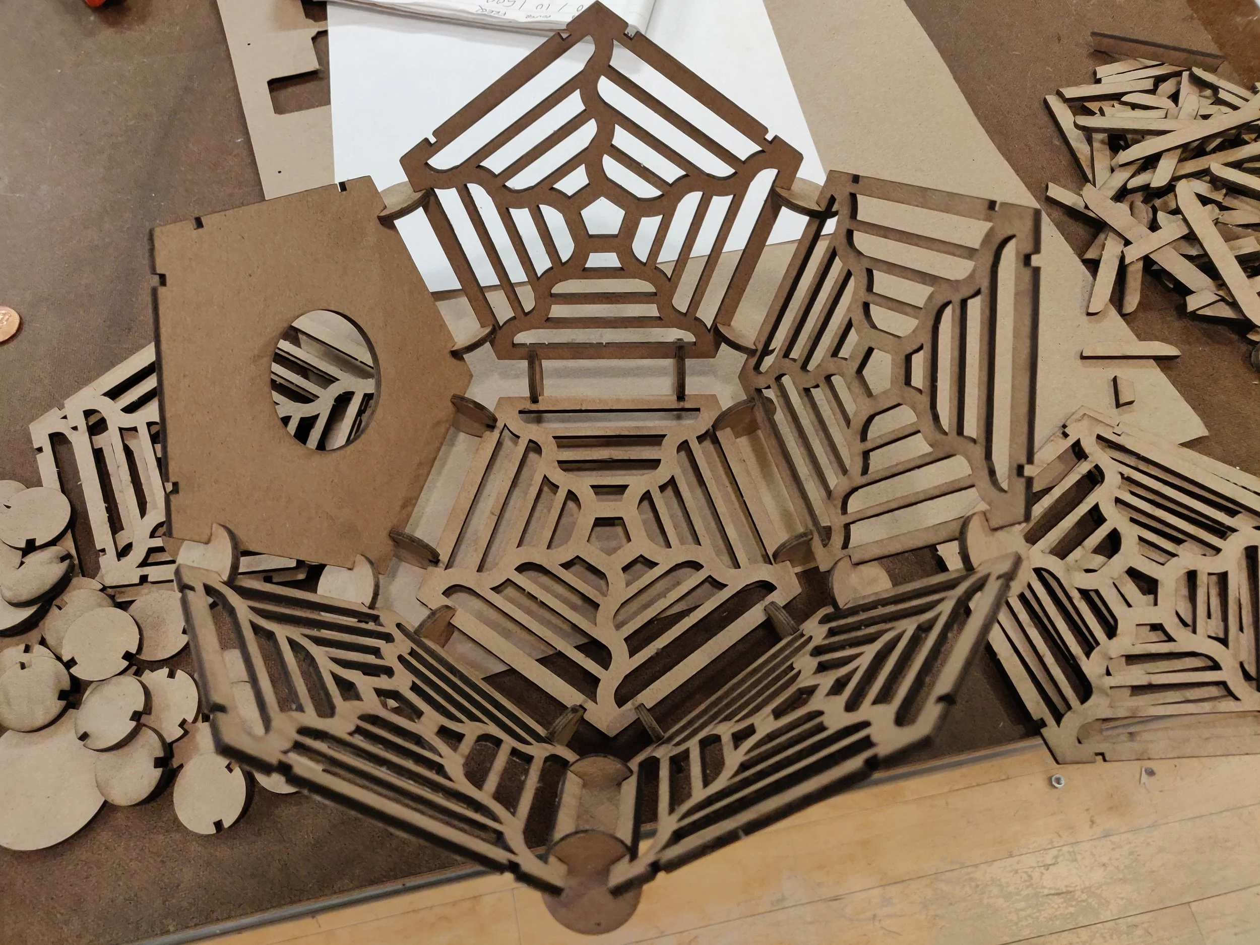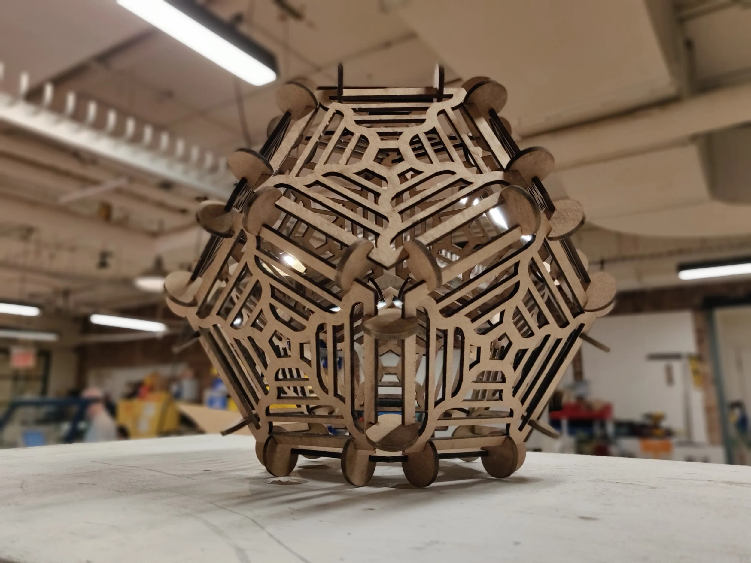 I decided to work with a dodecahedron, a 12 pentagonal faces 3d structure that would allow me to design an interesting pattern to be cut in order to let the light pass. I experimented with different shapes but decided to use more geometric (instead of fractals that was my first option) due to the complexity level and the time that it would take to laser cut such shapes.