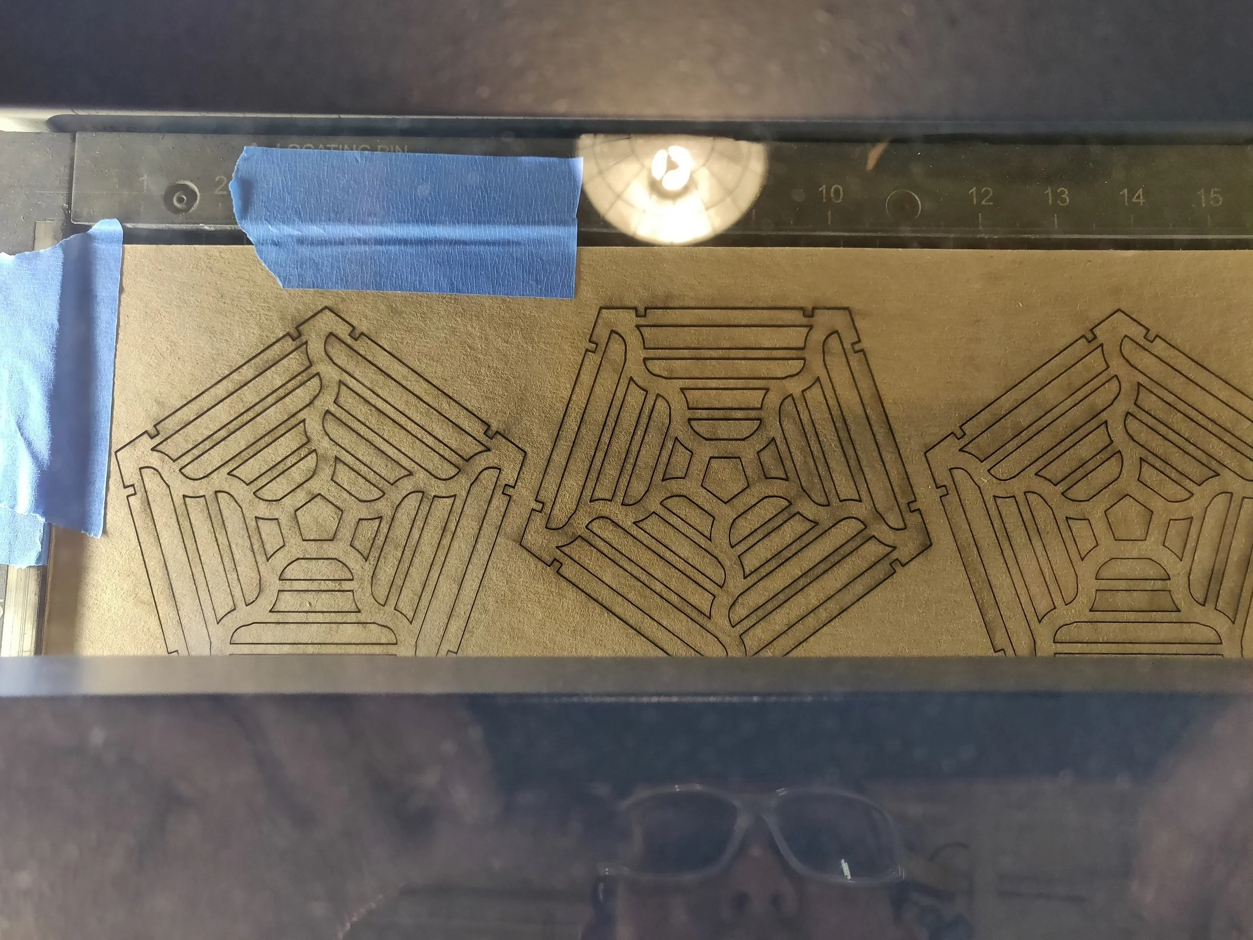 I realized that my pieces were a little bit burned out but that was the only way that I found in order to cut all the way throw the material. Also the time represented a challenge since I spent two hours cutting pieces, I had to cut 60 circular pieces and 12 pentagonal pieces.