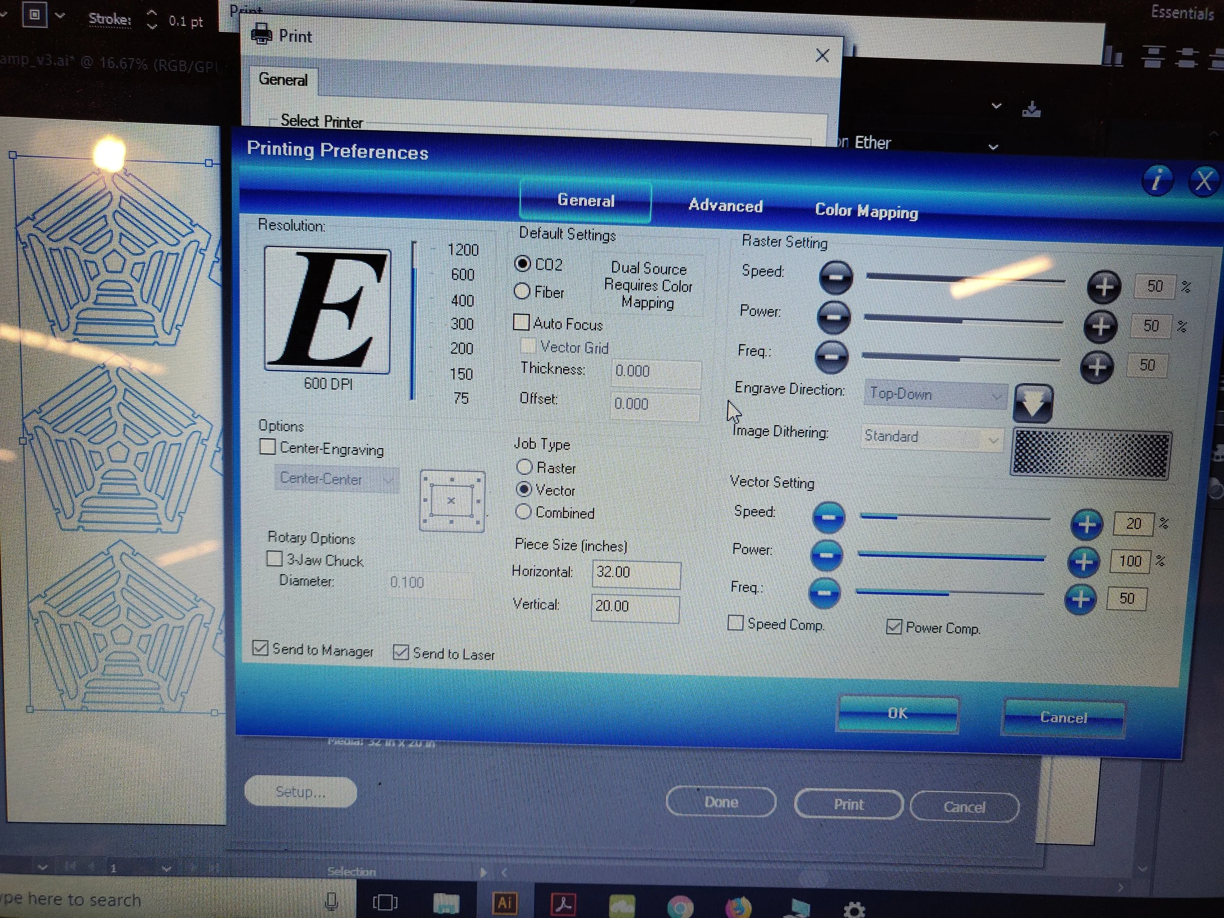 I decided to use the settings for wood since the ones for cardboard might not be powerful enough to cut all the way through. I had to deal with the fact that my material had glue in between the layers therefore that represented a challenge that I had to deal with while selecting the settings for the printer.