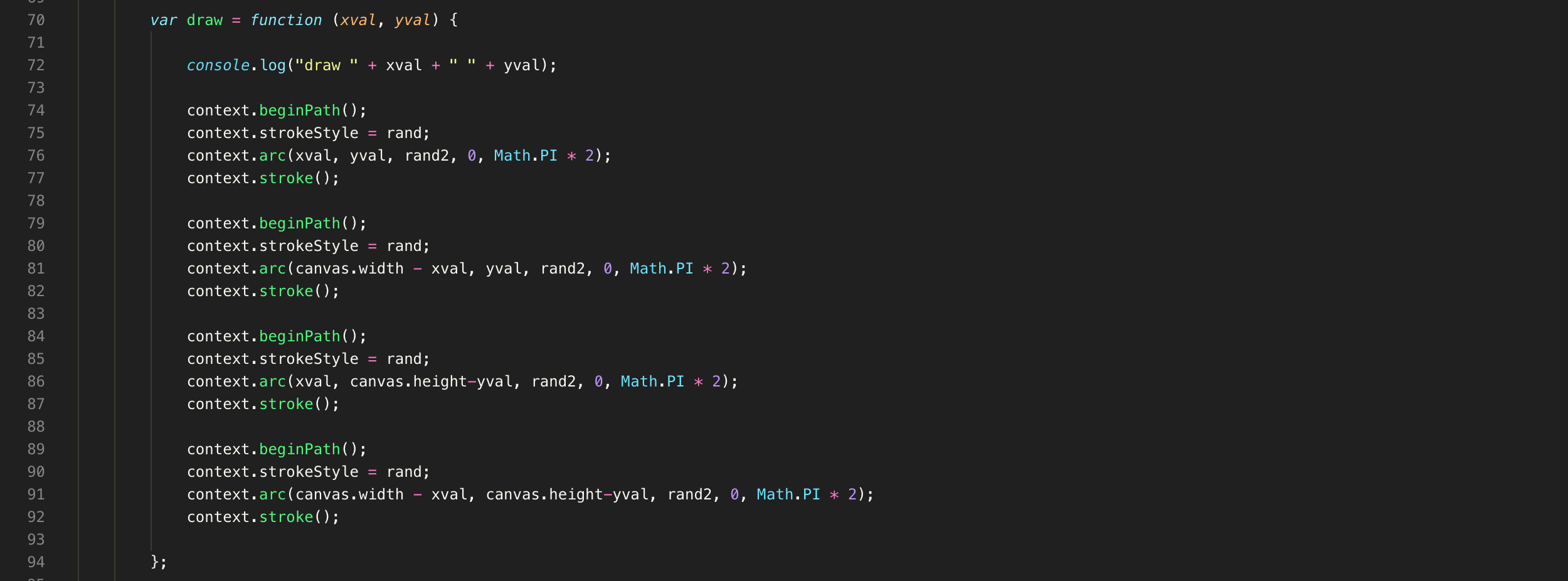 The next step in the process was to generate the 4 quadrants mirror functionality, which I had explore before in the past however I have to make sure that I could apply it to the html5 canvas element. I was able to remove the line in the center of the two circles and correctly mirror each circle in the 3 remaining quadrants.